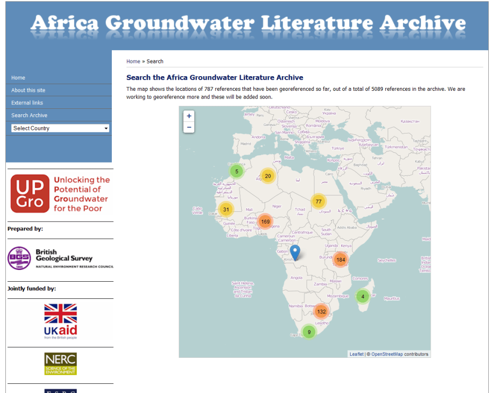 The Africa Groundwater Literature Archive is a searchable database of bibliographic references of groundwater literature for Africa (currently with approximately 6000 entries), including both unpublished reports (often unavailable by other means) and published journal articles. Where possible, full text downloads of documents, or direct links to documents held elsewhere, will be made available. In time the Archive will also incorporate