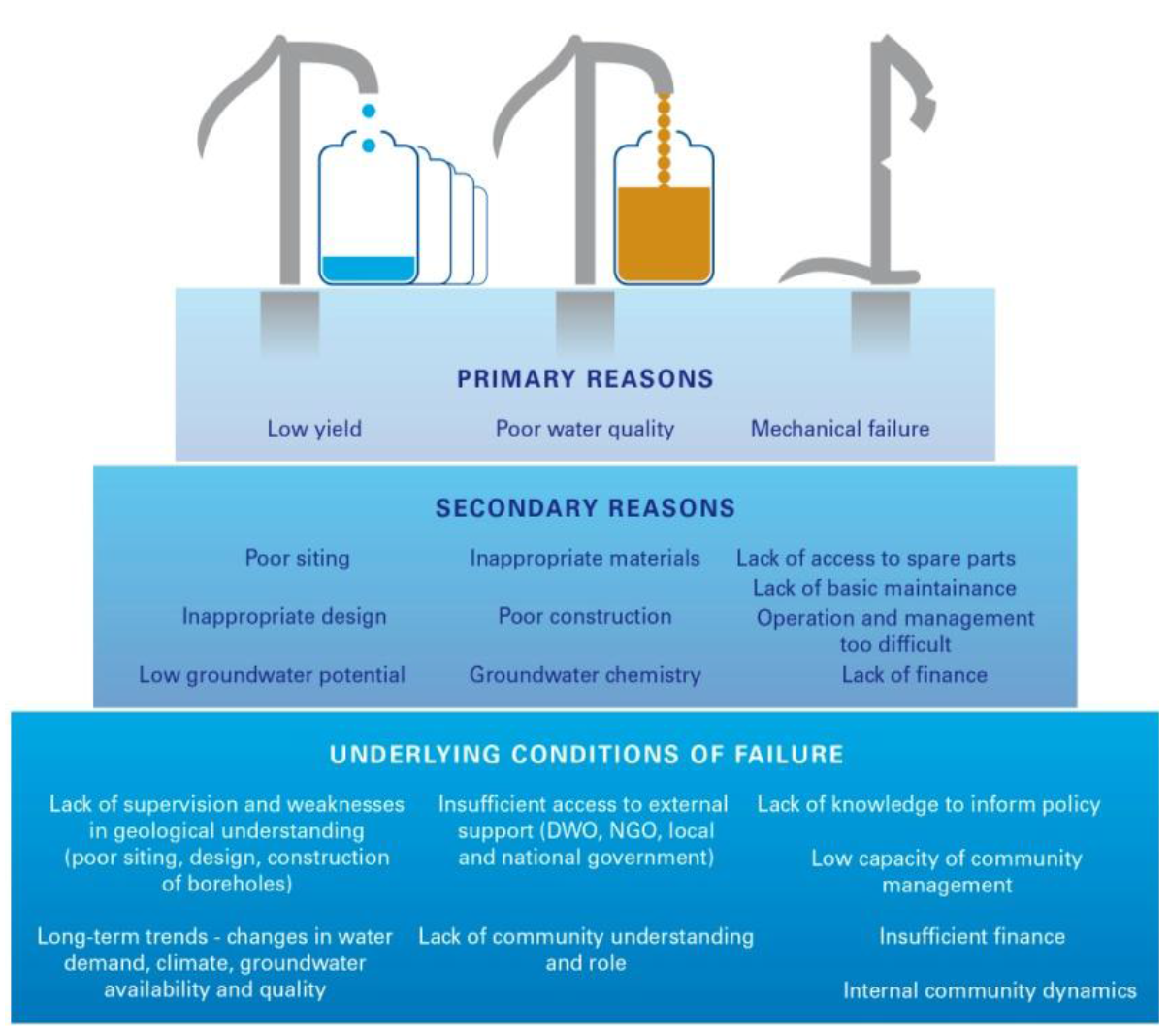 The underlying causes of rapid failure of approximately a third of African rural groundwater sources are complex and multi-faceted, but with interdisciplinary approaches can be understood, diagnosed and ultimately anticipated and mitigated.