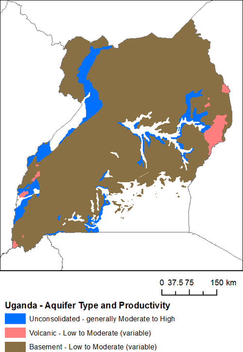 - Most of the rural population relies on groundwater, dominantly from shared boreholes equipped with handpumps. Most boreholes in Uganda tap groundwater from the weathered and/or fractured basement aquifer. The depth and yield of these boreholes varies, for example depending on the local rock lithology and the degree of weathering and fracturing: most boreholes are less than 80 m deep but they can be as deep as 200 m. Borehole yields can vary from 0.5 up to 50-80 m3/hour.